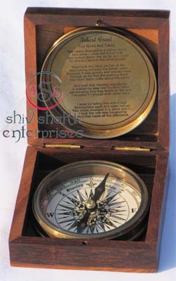 Poem CompassThis poem compass engraved with inside"The Road Not Taken.Robert Frost" Made of Solid Brass.Antique Look.Brass Direction Compass in proper working.the Lid poem is engraved.Brass Pocket Compass with Removable Lid is a beautiful solid brass reproduction of an antique air-damped compass.
