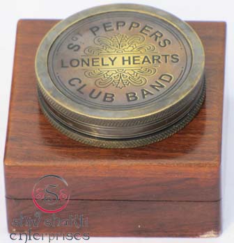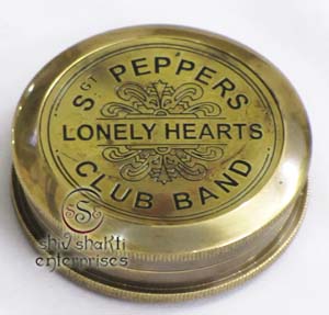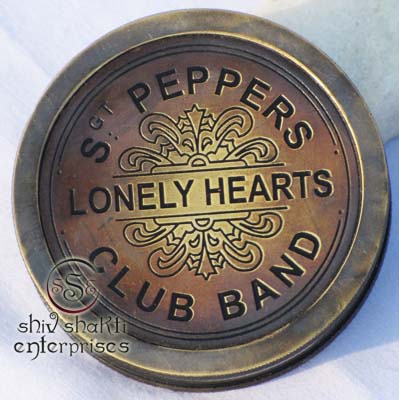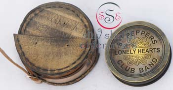 This is Solid Brass Antique Reproduction Compass with Leather Case.This Compss Engraved with "S GT PEPPERS LONELY HEARTS CLUB BAND" "YELLOW SUBMARINE" poem is engraved inside the lid of compass.