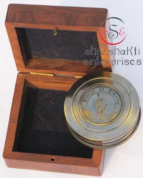 Antique Compass With BoxThis Compass Is Made Of Brass In Decent Look.This is an antique replica Compass.This Beautifull Brass Compass is in Good Working Condition.Small beautiful story is Engraved Under the Lid.This compass Has beautifull Wooden Box.Its Needle Shows Quick Deflection of North South Direction.