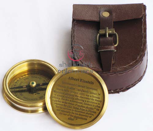 This is beautiful Albert Einstein Compass. Maritime Brown Antique Finish Nautical Brass Albert-Einstein Pocket Compass With Leather Cover Engraved With " MADE FOR ROYAL NAVY" LONDON.