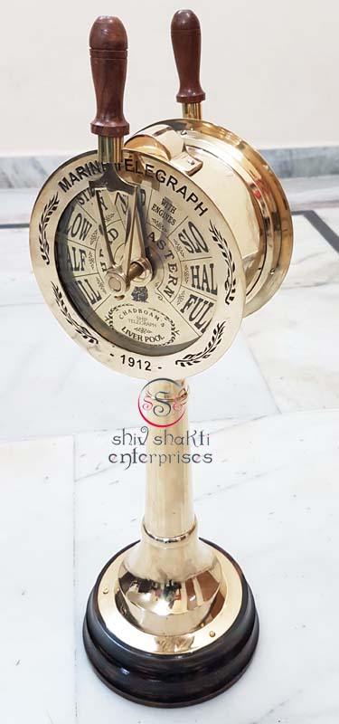 Brass Ship TelegraphThis Magnificent Ship Telegraph is made of Brass & Wood. Non Working Telegraph. It is a new reproduction of an ancient engine room telegraph and it is beautifuly handcrafted. It is Beautiful Decorative Item. Engine Order Telegraphs are used to send a signal from the bridge to the engine room with instructions about speed and direction (ahead or astern).