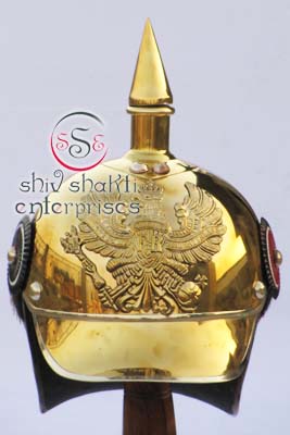 Our organization ensures that we utilize high quality raw material like brass to manufacture our mesmerizing range of German Helmets.This Iron German Helmet With Bras "FR EAGLE BADGE" with Brass Officer's Spiked Pickelhaube Helmet.It is made of 18 gauge solid steel. It is adult size and wearable helmet. These beautiful helmet for collector. All work is hand made.