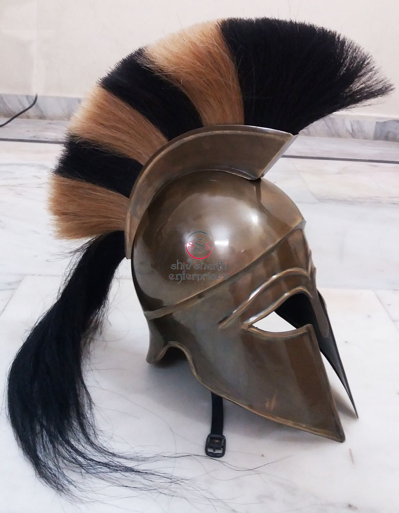 Medieval Corinthian HelmetThis ready-to-wear helmet is crafted from an actual design used in the Greek city-state of Corinth. This excellent replica is hand made from carbon steel with a black finish. This item includes a removable black hair crest. This is a fantastic item for historical re-enactors or serious collectors!