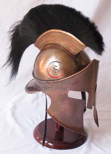 Corinthian Helmet W/ PlumeBrass Greek Corinthian helmet is made of 18 gauge mild steel in polish finish. Fully adult size wearable helmet. It comes with inner leather liner for comfort wearing. Corinthian helmet with an authentic plume that is removable.