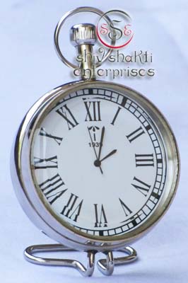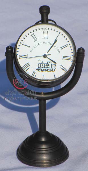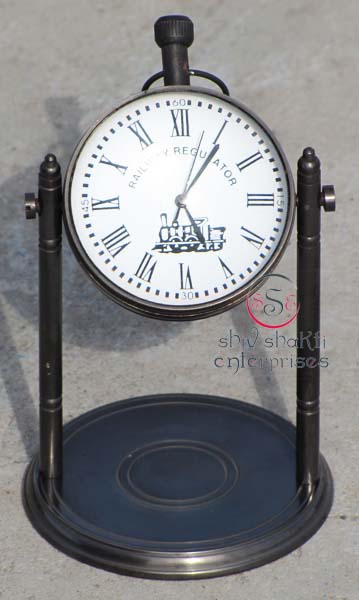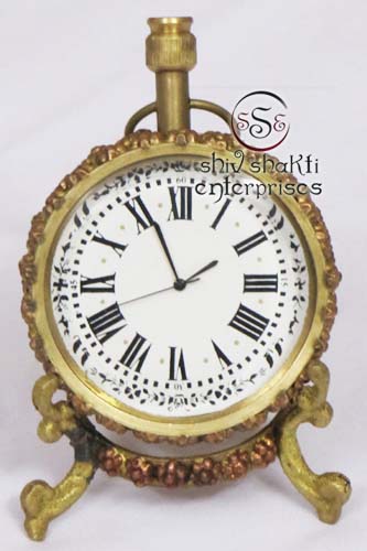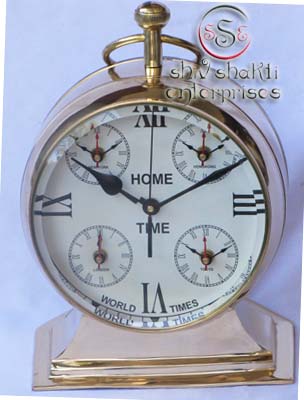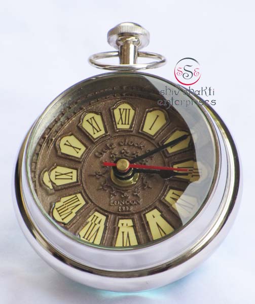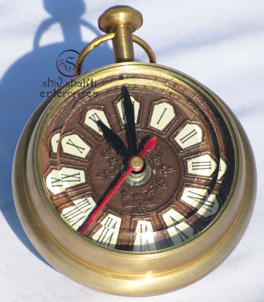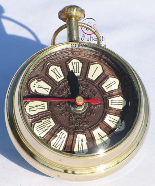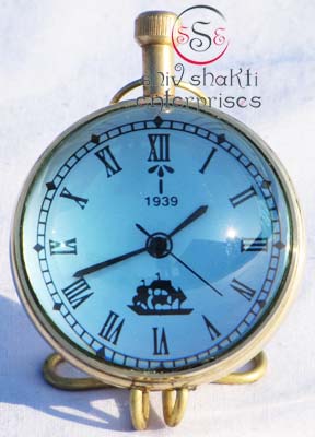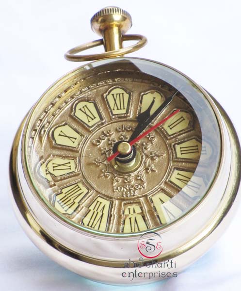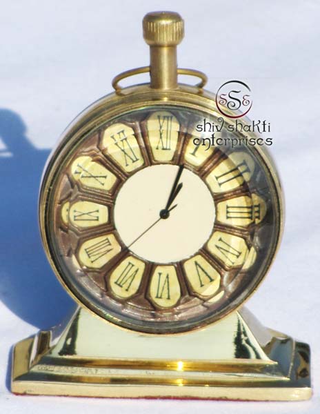 It is made of brass. This is beautiful Robert Stand clock for collector. We are manufacturer & exporter of nautical. A beautiful nautical clock. Beautiful clock for home decor, office, compant etc. 2inch diameter clock is decorative desktop paperweight clock. A beautiful corporate gift.