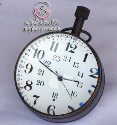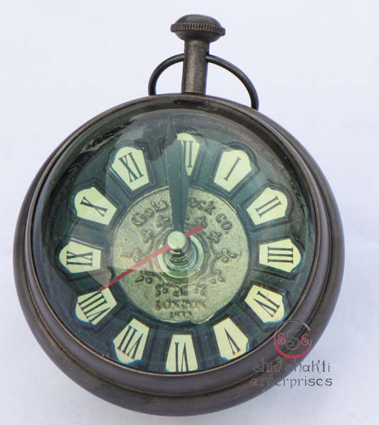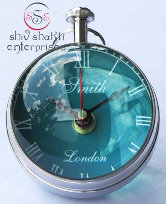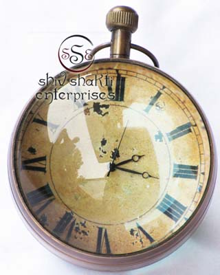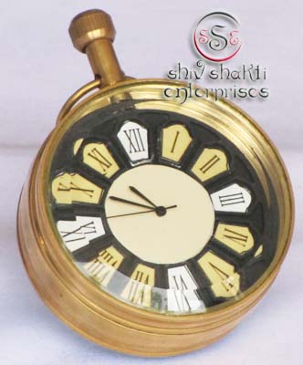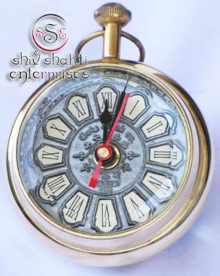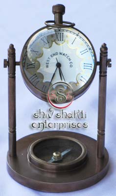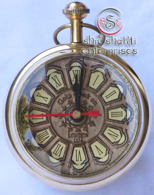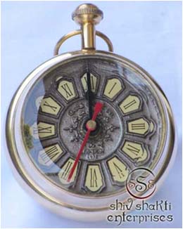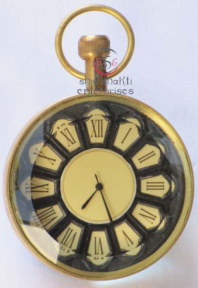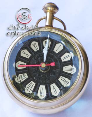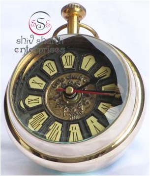 It is made of brass. This is beautiful Pen holder clock for collector. We are manufacturer & exporter of nautical. A beautiful nautical clock. Beautiful clock for home decor, office, compant etc. 7.5cm diameter clock is decorative desktop paperweight clock. A beautiful corporate gift.