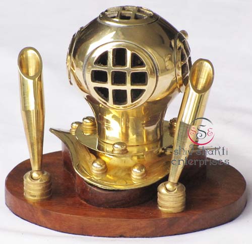 Pen Stand W/Divers Helmet This is Beautiful pen holder with diving helmet. This is beautiful Gift For Collector. Nice Collection For nautical item.Very Beautiful Desighn pen holder stand. this is beautiful for home decoration, table top pen holder.