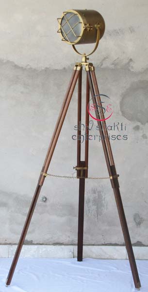 Nautical spot light with Tripod Here is Great nautical spot search light Nice Heavy Quality Spot light marine collection. nautical search light made of good quality Light is made of aluminum & Stand is made of Timber & aluminum.This is beautiful search light is use for room corner & photography and focus some one also.