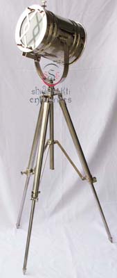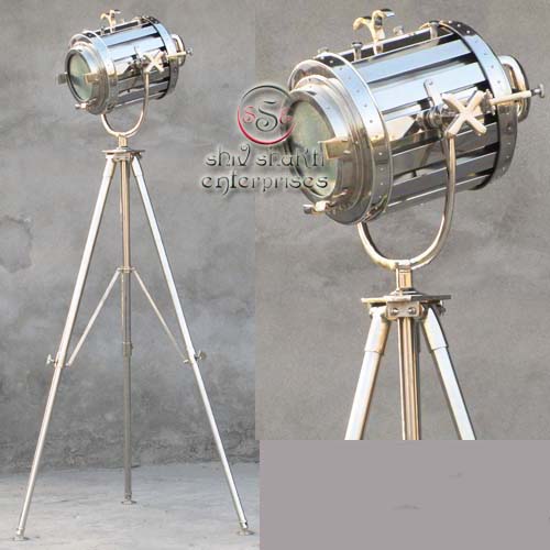 Searchlight On Tripod StandSearch Light with Tripod Stand It Comes with Electric Fitting. This is beautiful search light is use for room corner & photography and focus some one also.Light & Stand is made of Aluminum & Stainless Steel. This piece has a nautical feel which is both cool and modern.