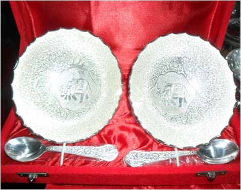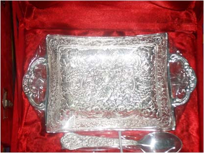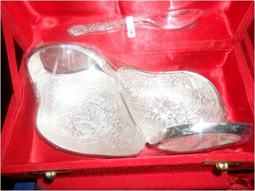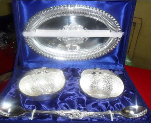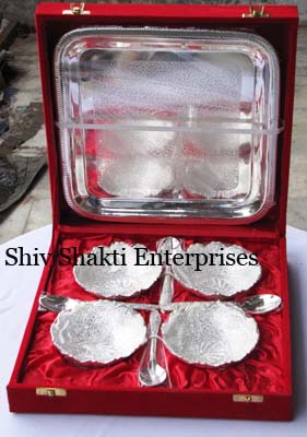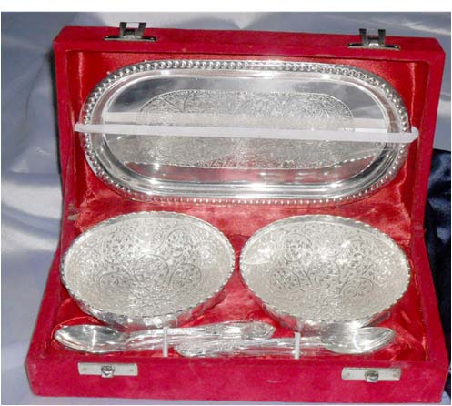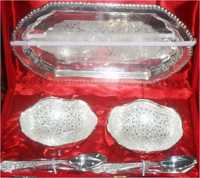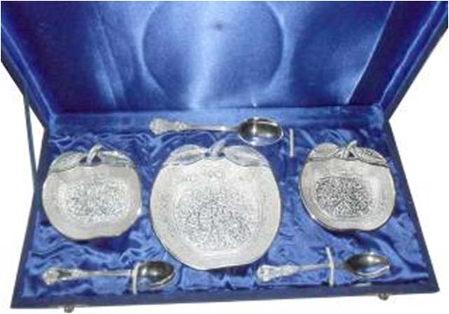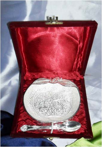 Silver Plated Bowl w/ Tray & SpoonThis is nice Bowl set with big plate & spoon. In this set 2 Fruit shape bowl & 2 spoon with one plate. Beautifully decorated with floral carvings to give a traditional look. Exclusive utility item to serve your guest in style. A classy gift item for all occasions. Comes in a velvet covered wooden box (Just like a piece of Jewel).
