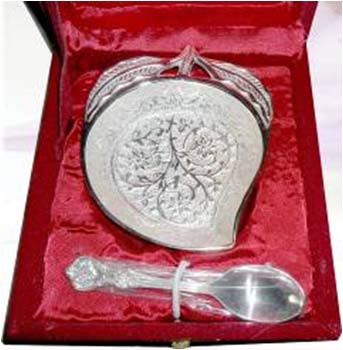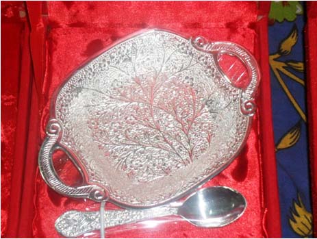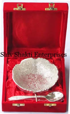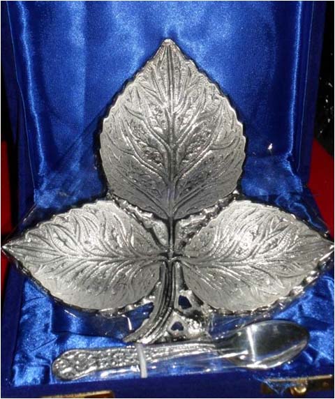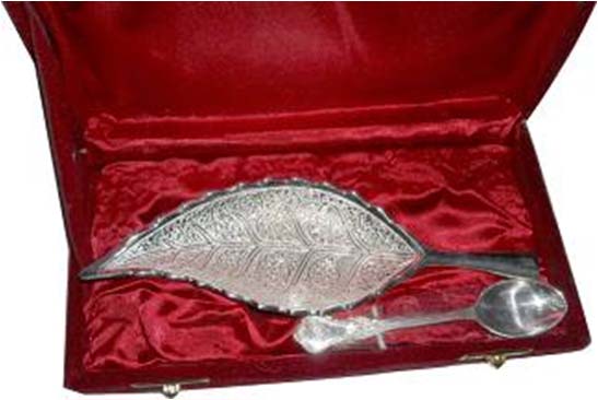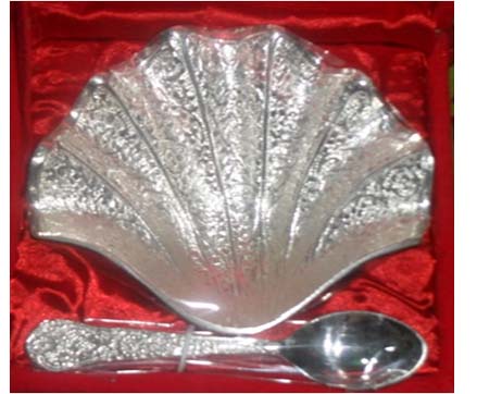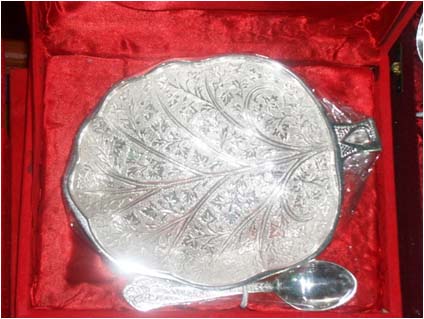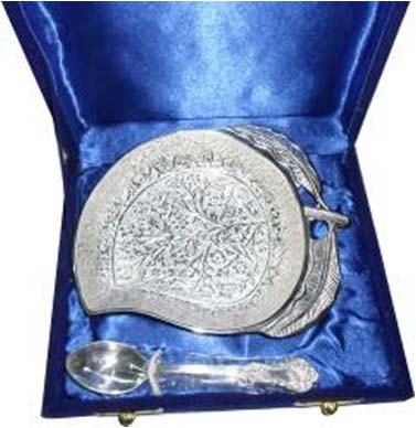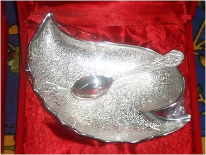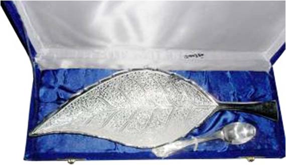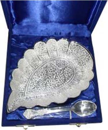 Leaf Shape Bowl With SpoonAll items are silver plated, with the base metal being either brass, aluminum, copper or steel. Each metal gives a different look and, hence, the range of items is varied. Silver plating renders the item cost-effective, especially at a time when the cost of silver is mounting all the time.