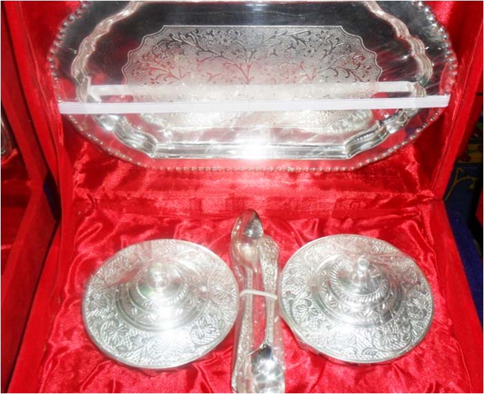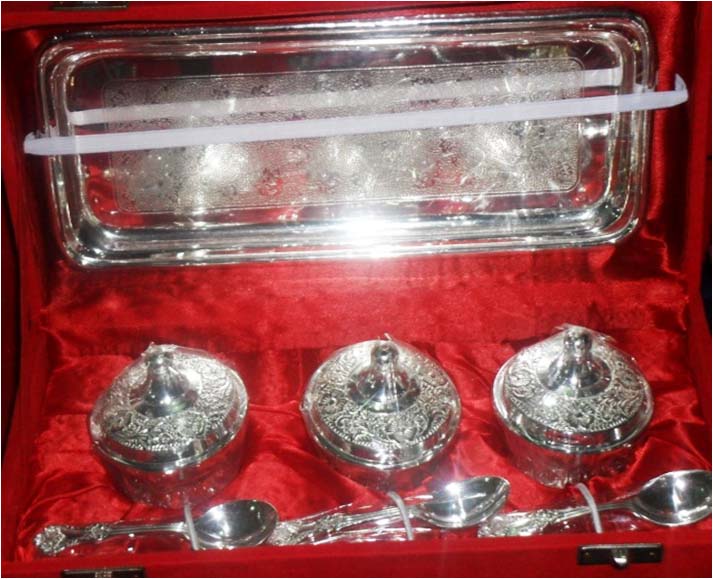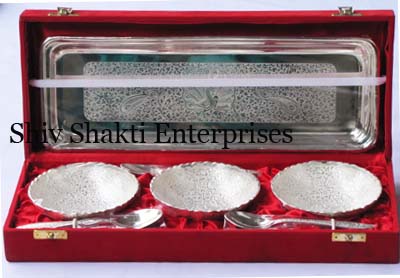 Silver plated designer three bowl along with spoon each and a tray. Beautifully decorated with floral carvings to give a traditional look.Exclusive utility item to serve your guest in style. A classy gift item for all occasions. Comes in a velvet covered wooden box (Just like a piece of Jewel).