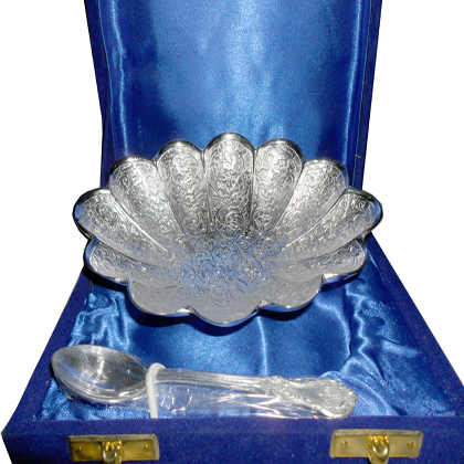 Flower shaped BowlFlower shape silver plated designer bowl along with a spoon with intricate design.Beautifully decorated with floral carvings to give a traditional look. A must have accessory for your dining table. Exclusive utility item to serve your guest in style. A classy gift item for all occasions. Comes in a velvet covered wooden box (Just like a piece of Jewel).