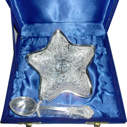Silver Plated Star Shaped BowlStar shape silver plated designer bowl along with a spoon with intricate design.Beautifully decorated with floral carvings to give a traditional look. A must have accessory for your dining table. Exclusive utility item to serve your guest in style. A classy gift item for all occasions. Comes in a velvet covered wooden box (Just like a piece of Jewel).