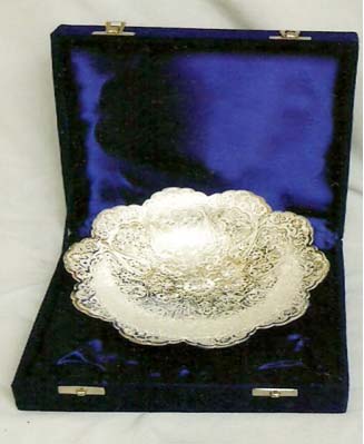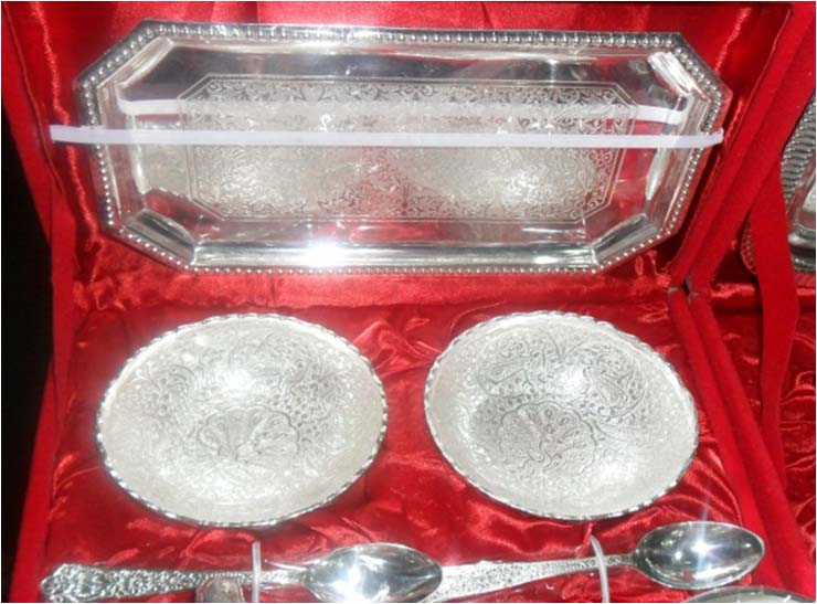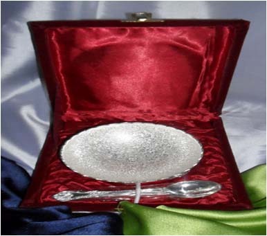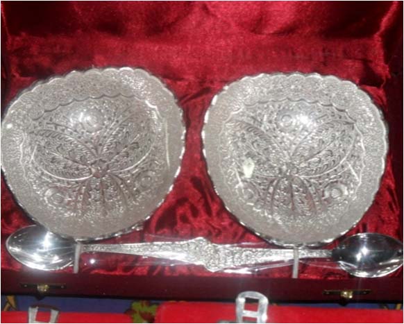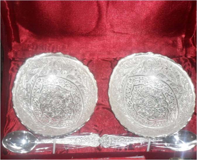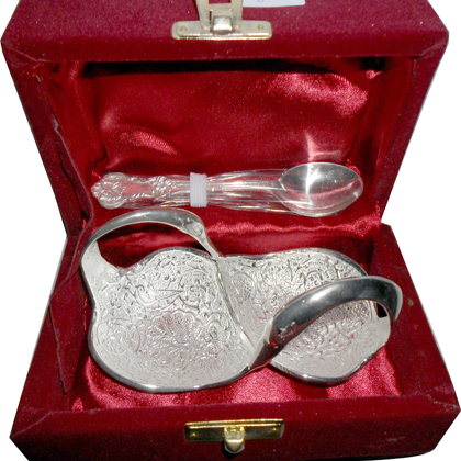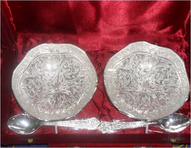 This is nice Bowl set with plate & spoon. In this set 2 bowl & 2 spoon with one plate. Beautifully decorated with floral carvings to give a traditional look. Exclusive utility item to serve your guest in style. A classy gift item for all occasions. Comes in a velvet covered wooden box (Just like a piece of Jewel).