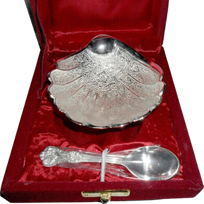 Shell shape silver plated designer bowl along with a spoon. Beautifully decorated with floral carvings to give a traditional look. A must have accessory for your dining table. Exclusive utility item to serve your guest in style. A classy gift item for all occasions. Comes in a velvet covered wooden box.