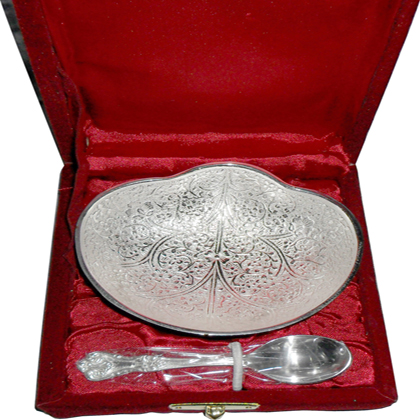Leaf shape designer silver plated designer bowl along with a spoon with intricate design. Beautifully decorated with floral carvings to give a traditional look. A must have accessory for your dining table. Exclusive utility item to serve your guest in style. A classy gift item for all occasions.