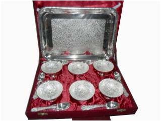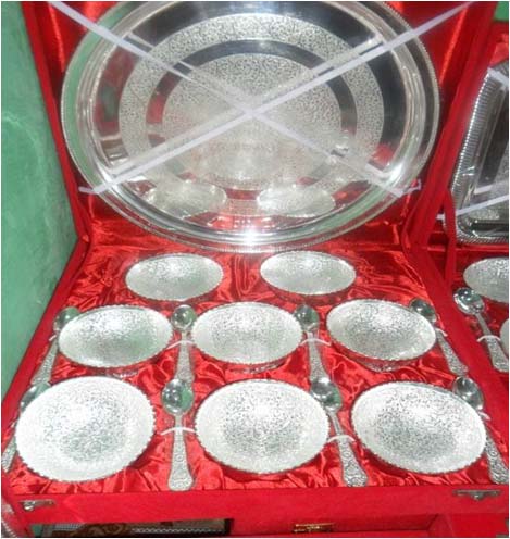 This is nice Bowl set with big plate & spoon. In this set 8 bowl & 8 spoon with one plate. Beautifully decorated with floral carvings to give a traditional look. Exclusive utility item to serve your guest in style. A classy gift item for all occasions. Comes in a velvet covered wooden box (Just like a piece of Jewel).