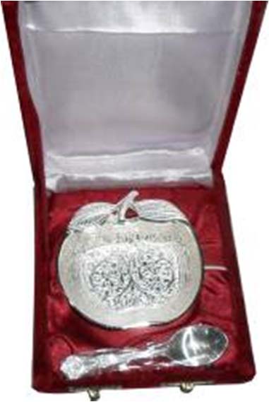 Apple shape silver plated designer bowl along with a spoon. Beautifully decorated with floral carvings to give a traditional look. A must have accessory for your dining table. Exclusive utility item to serve your guest in style. A classy gift item for all occasions. Comes in a velvet covered wooden box (Just like a piece of Jewel).