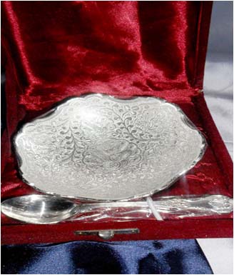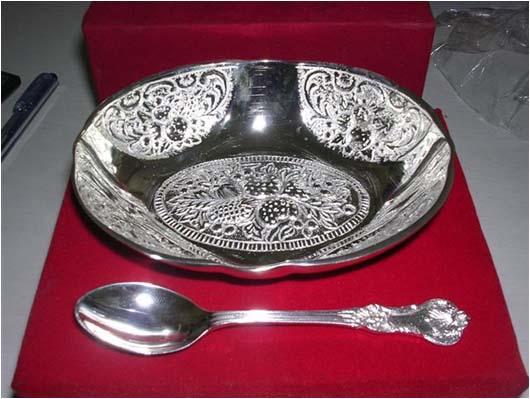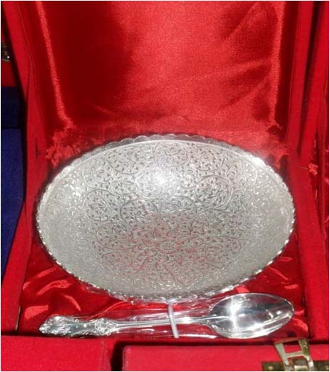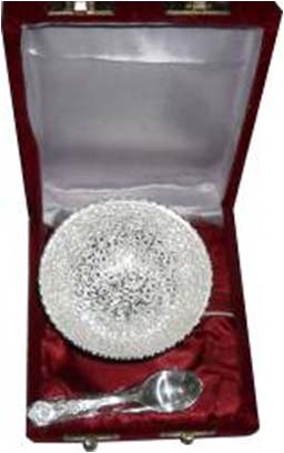 BowlRound shape silver plated designer bowl along with spoon. Beautifully decorated with floral carvings to give a traditional look. Exclusive utility item to serve your guest in style. A classy gift item for all occasions. Comes in a velvet covered wooden box (Just like a piece of Jewel).