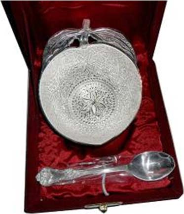 This designer silver plated bowl Set along with a spoon each with intricate design. Beautifully decorated with floral carvings to give a traditional look. A must have accessory for your dining table. Exclusive utility item to serve your guest in style. A classy gift item for all occasions.
