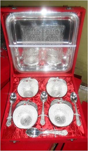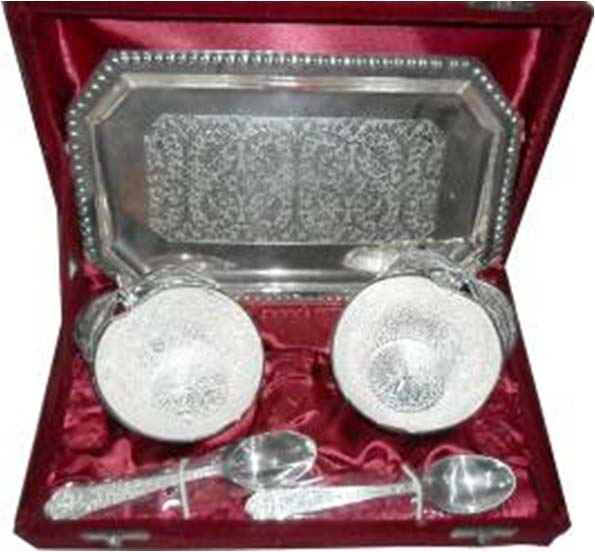 Vintage Tray w/ BowlThis is nice Bowl set with plate & spoon. In this set 2 bowl & 2 spoon with one plate. Beautifully decorated with floral carvings to give a traditional look. Exclusive utility item to serve your guest in style. A classy gift item for all occasions. Comes in a velvet covered wooden box (Just like a piece of Jewel).