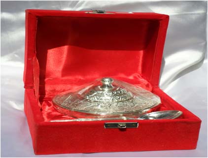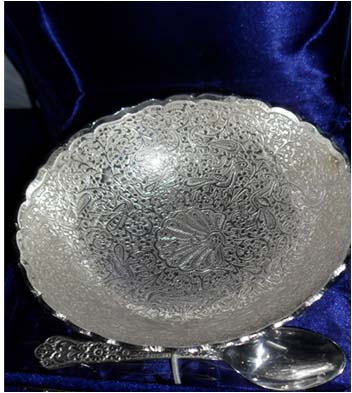 Silver plated designer bowl along with a spoon. Beautifully decorated with floral carvings to give a traditional look. A must have accessory for your dining table. Exclusive utility item to serve your guest in style. A classy gift item for all occasions. Comes in a velvet covered wooden box (Just like a piece of Jewel).