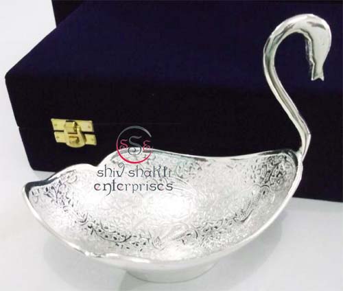 Silver Plated Brass Swan Utility BowlSilver plated brass swan utility bowl with ornate spoon. The silver-plated brass swan serving bowl with an ornate spoon that looks magnificent on your table. Delicate but prominent swans create lovely handles. Ideal for serving your dry fruits, sweets and savories.