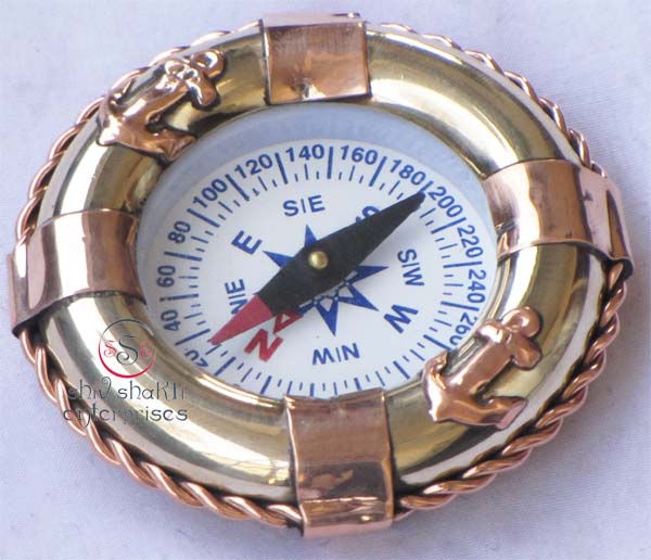 Life Ring Buoy Paperweight Compass is a reproduction of an antique paperweight compass. The Life Ring Buoy Paperweight Compass is made of solid brass and copper and is the perfect addition to any office. Its heavy brass composition makes for a sturdy paperweight while its large compass face allows a quick and accurate reading.