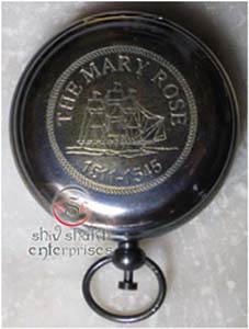 This antique compass looks Push Button Compass It has a brass trim and a smaller face. A push button connected to a ring when pushed will pop open the compass and reveal a Antique mirror-like back lid. Front Engraved " THE MARY ROSE 1511-1545".