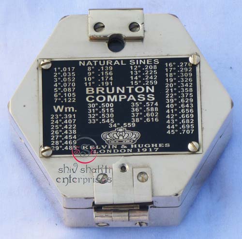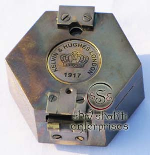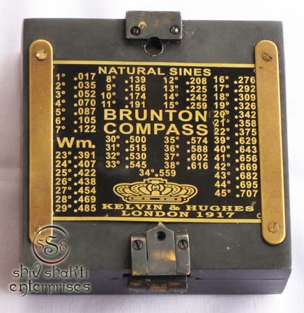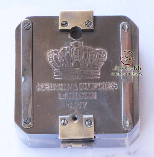 This solid brass compass is durable and heavy for its size. It is a functional compass and has a lid. Inside the lid is a mirror. This is a reliable large size brass polished Brunton Compass. This compass is made of fully brass.Engraved in front side "KELVIN & HUGHES LONDON 1917".