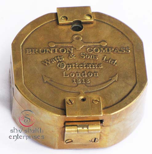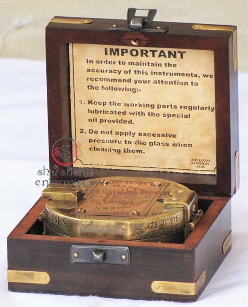 This is a reliable large size brass polished Brunton Compass that comes in a hardwood box with brass inlay. This is an antique Compass. This Brunton Compass measures 7.6 x 7 x 3cm. This compass is made of fully brass.