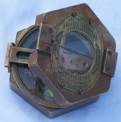 Made of brass.The sundial compass would be set to North, and the sundial would be adjusted on its hinge according to the season to indicate the time with remarkable accuracy
