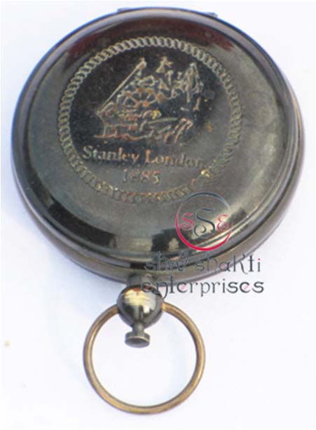 This antique compass looks Push Button Compass It has a brass trim and a smaller face. A push button connected to a ring when pushed will pop open the compass and reveal a Antique mirror-like back lid. Front Engraved "Stanley London 1917".