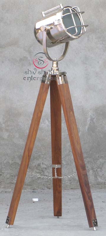 Nautical spot light with Tripod Here is Great nautical spot search light Nice Heavy Quality Spot light marine collection. nautical search light made of good quality Light is made of aluminum & Stand is made of Timber & aluminum.This is beautiful search light is use for room corner & photography and focus some one also.